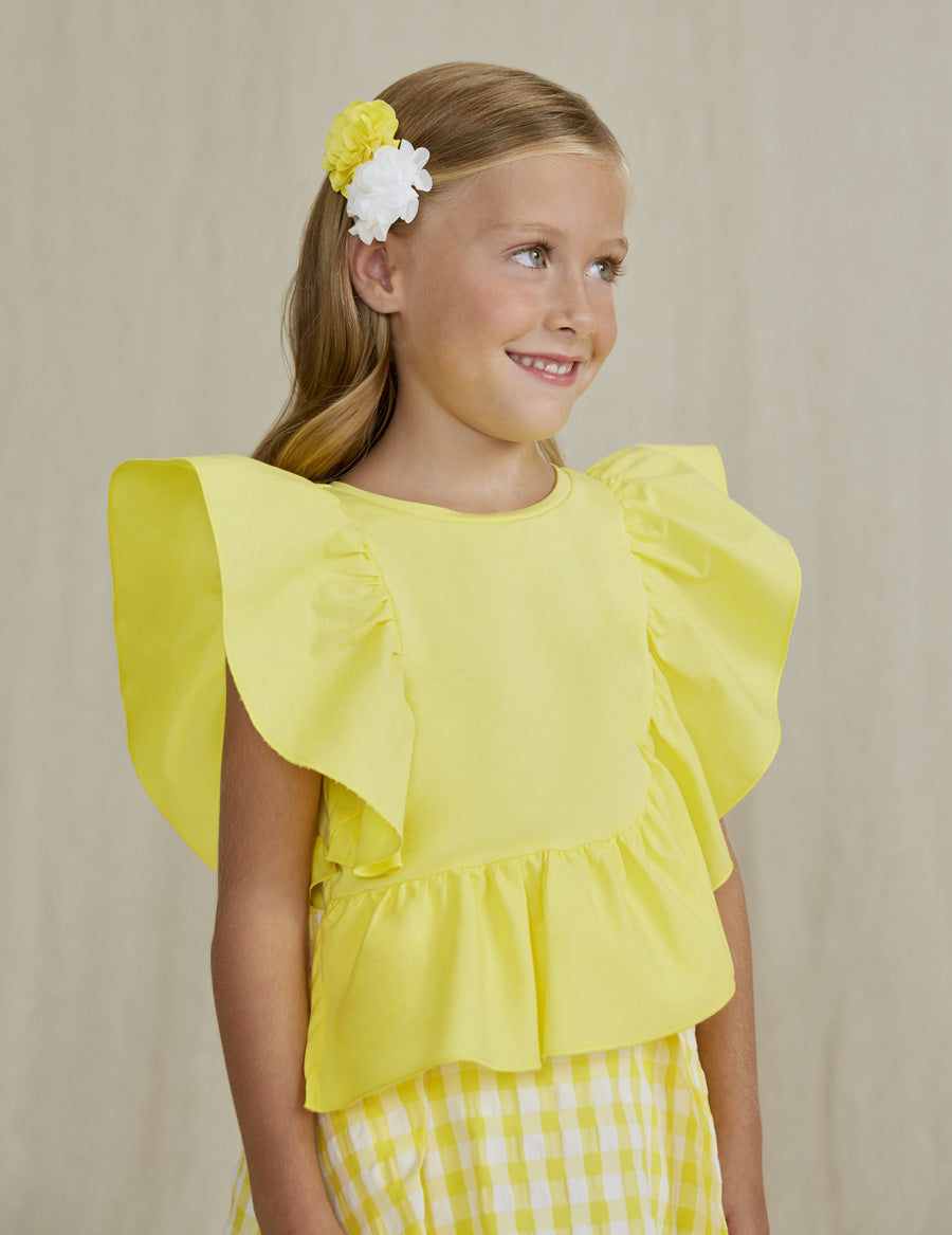 Elegant t-shirt combined with poplin frills. This garment is ideal for adding a touch of sophistication to any look